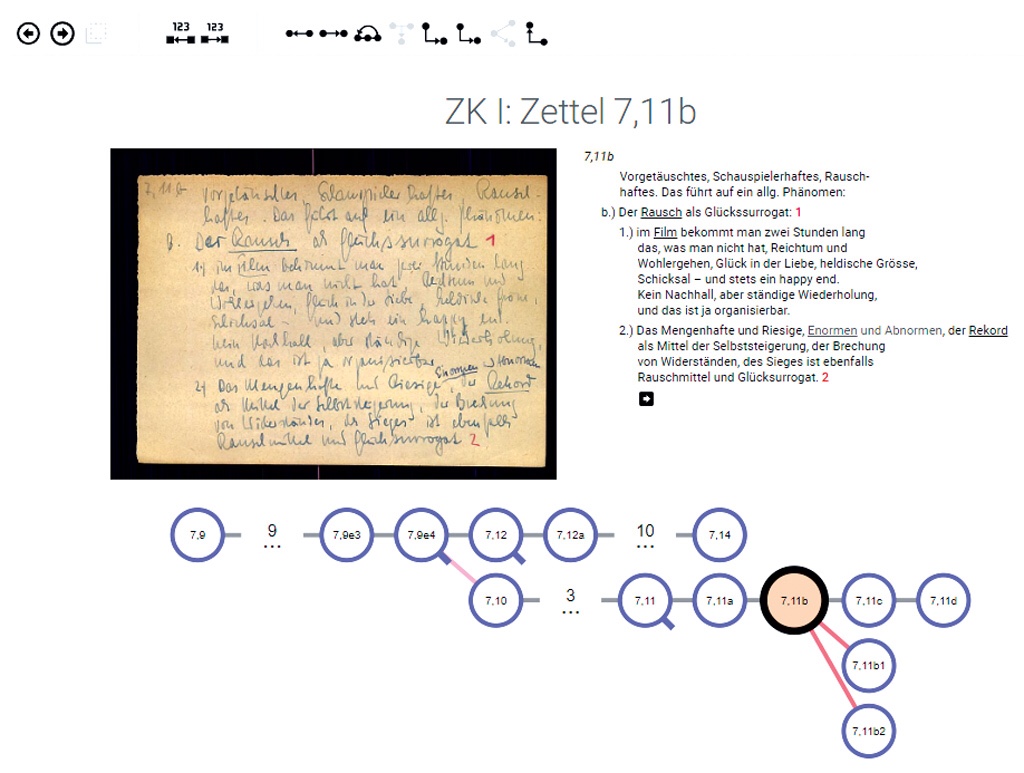 « Il n’y a pas de linéarité, mais un système en toile d’araignée, qui peut trouver un commencement partout. Pour décider ce que je vais mettre à telle ou telle place dans le fichier, je peux procéder en toute liberté, dans la mesure où j’indique aussi les autres possibilités par référence. Si l’on procède toujours ainsi, alors se crée une structure interne, qui n’y a jamais été introduite comme telle, mais que l’on peut cependant extraire. »