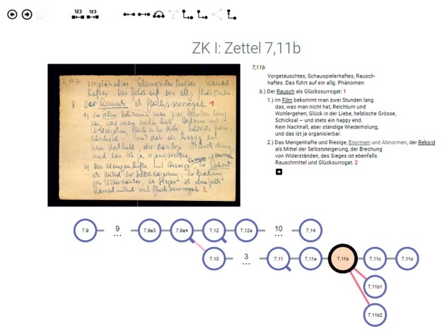 « Il n’y a pas de linéarité, mais un système en toile d’araignée, qui peut trouver un commencement partout. Pour décider ce que je vais mettre à telle ou telle place dans le fichier, je peux procéder en toute liberté, dans la mesure où j’indique aussi les autres possibilités par référence. Si l’on procède toujours ainsi, alors se crée une structure interne, qui n’y a jamais été introduite comme telle, mais que l’on peut cependant extraire. »